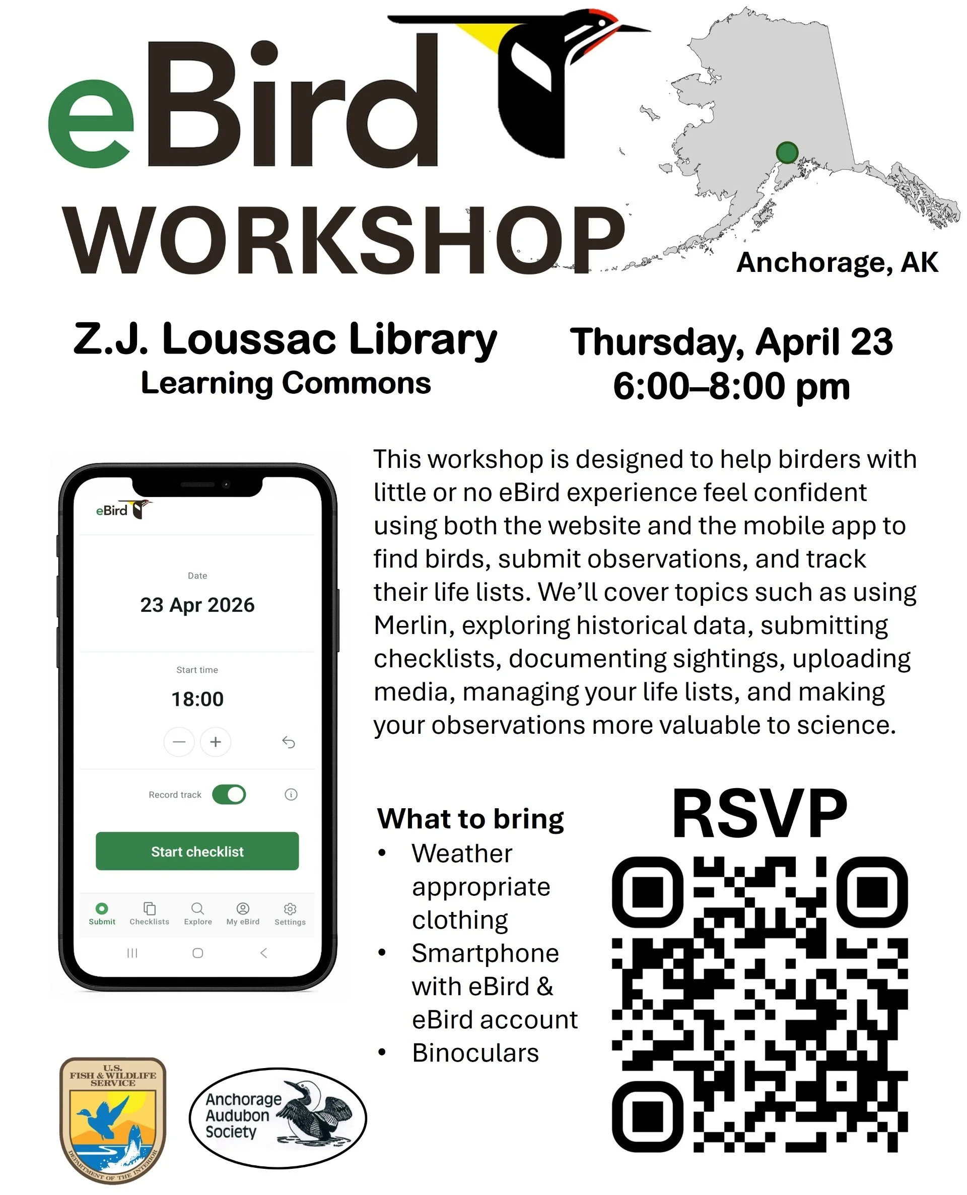 This workshop is designed to help birders with little or no eBird experience feel confident using both the website and the mobile app to find birds, submit observations, and track their life lists. We’ll cover topics such as using Merlin, exploring historical data, submitting checklists, documenting sightings, uploading media, managing your life lists, and making your observations more valuable to science.